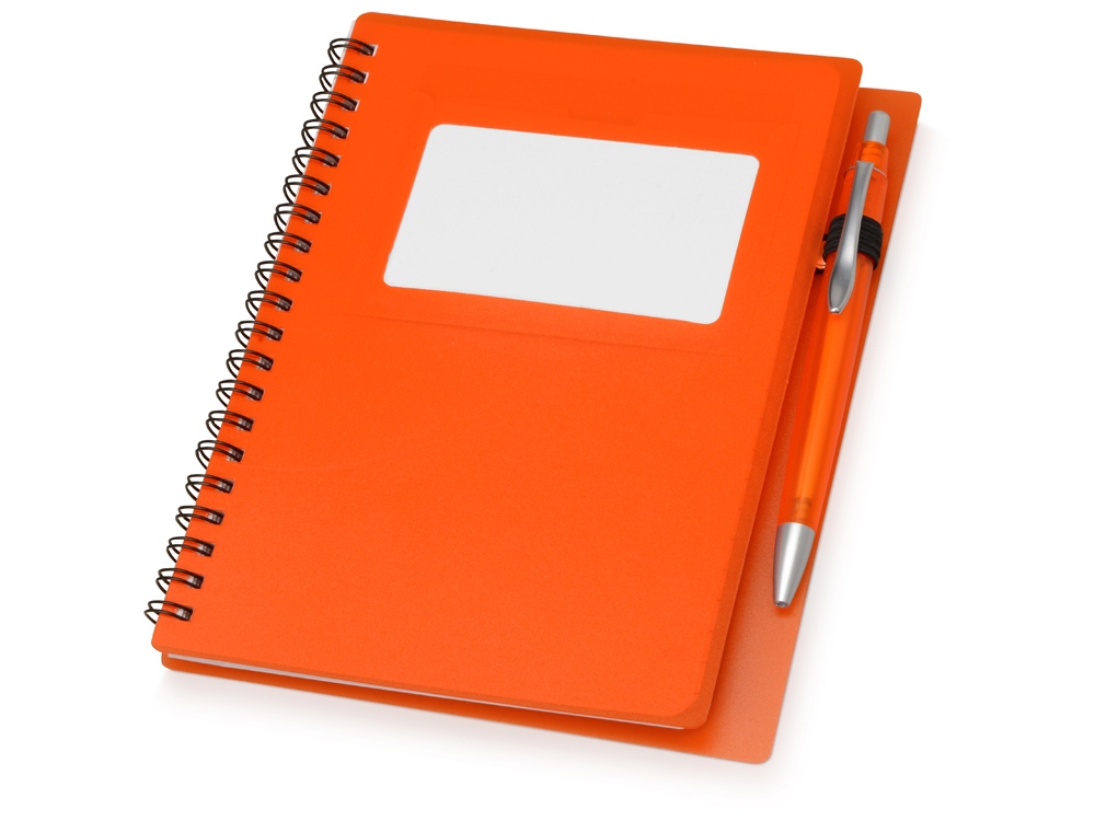 Блокнот Контакт в полипропиленовой обложке переплетен на пружине. В обложке блокнота предусмотрено окошко, в которое можно поместить визитную карточку или полиграфическую вставку. В комплекте с блокнотом идет ручка, которая вставляется в петельку сбоку.