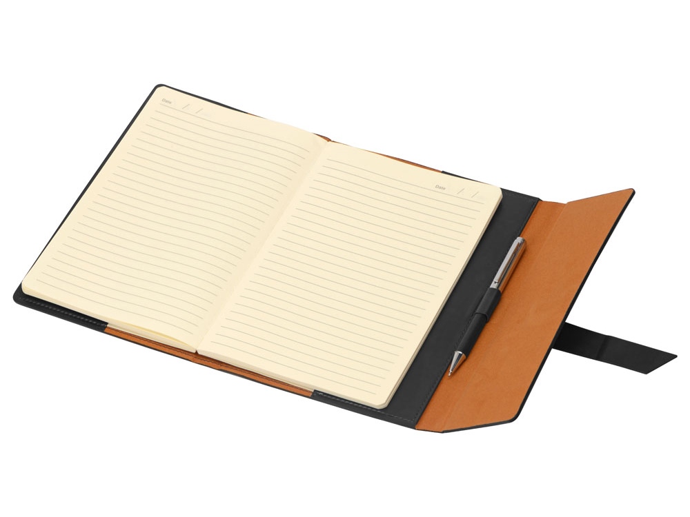 Бизнес-блокнот формата А5 в твердой обложке из искусственной кожи с ручкой в тон станет отличным подарком для любого клиента. Блокнот состоит из обложки с клапаном и сменного блока с линованными страницами. Тиснение (Блинт) на данный товар осуществляется бесплатно. Оплачивается только настройка оборудования в размере 8700 рублей на весь тираж.