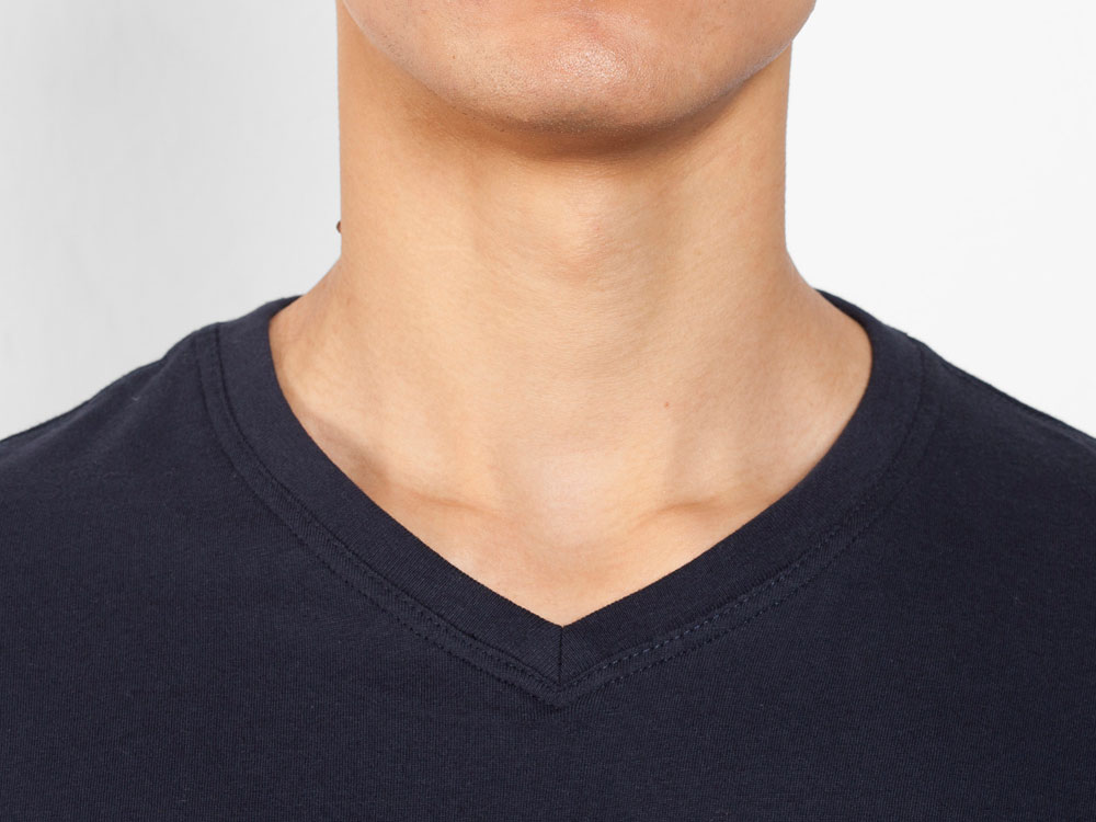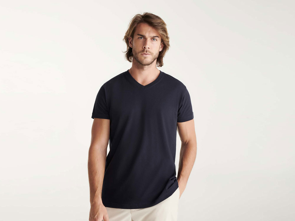 Мужская футболка без боковых швов с коротким рукавом и V-образным вырезом горловины, отделанном рибом 1х1. Горловина и плечевые швы дополнительно укреплены тесьмой.