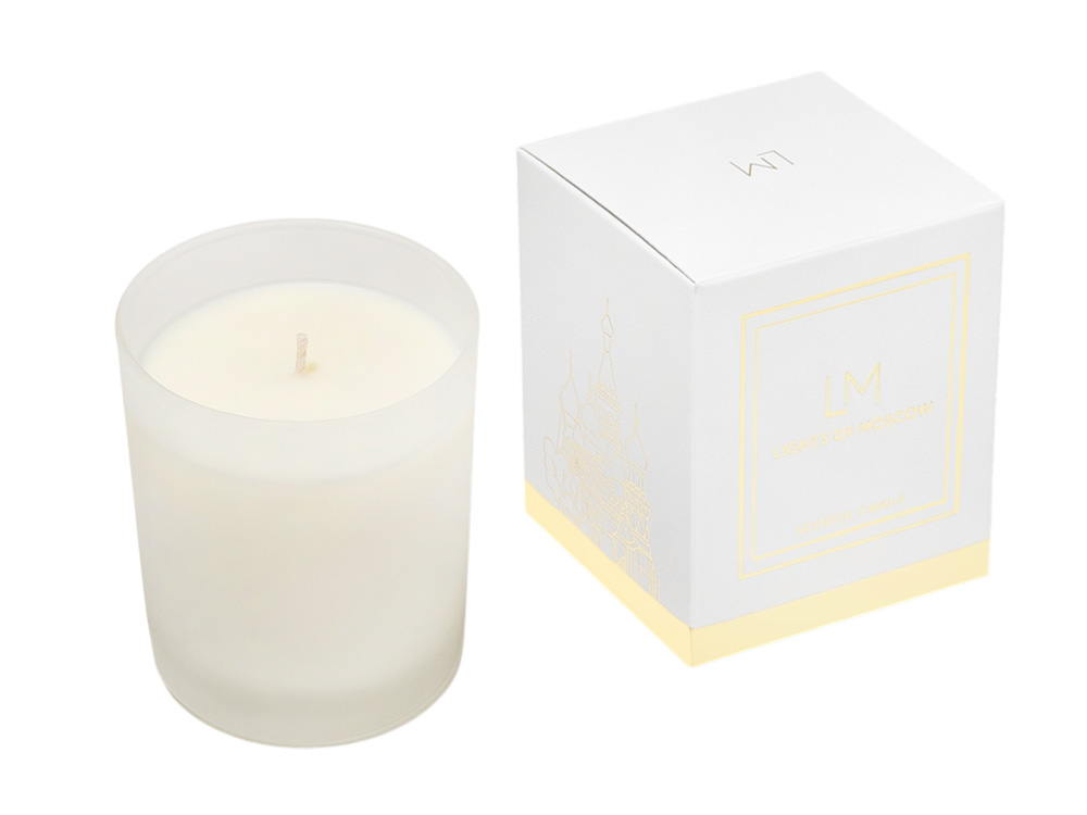 Коллекция аромасвечей Exclusive является уникальной не только из-за ароматов коллекции, но и благодаря тщательно разработанному дизайну упаковки, которая является напоминанием о том, что бренд Lights of Moscow - это ручное российское производство в самом центре Москвы. Белая коробка оформлена ярким золотым фольгированием, на левой стороне которой изображен Храм Василия Блаженного - одна из главных достопримечательностей на Красной площади в Москве.
